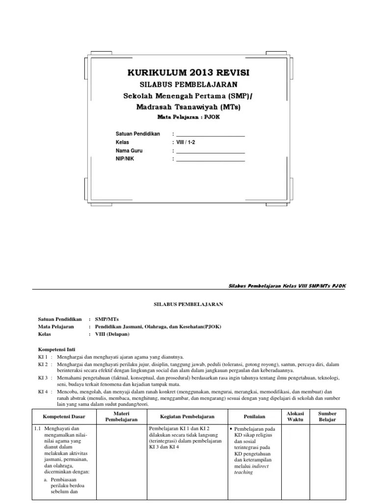 Silabus pjok smp mts kurikulum 2013 ini dapat menjadi pedoman dalam menyusun rencana kegiatan pembelajaran pjok kelas vii, viii, .